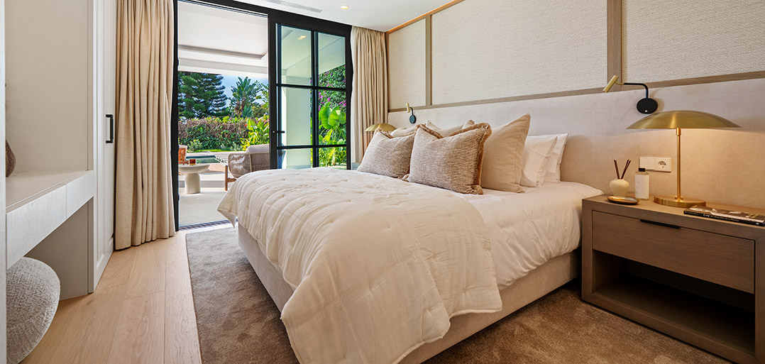 A pretty path leads to the front double doors welcoming into a spacious open plan reception with amble space for dining, an elegant sitting area and a fully fitted trendy kitchen with all appliances needed for every day living. In addition, on the main floor one finds two double bedroom suites. From the reception sliding patio doors opens out to a covered terrace with views across the private swimming pool to the sea.