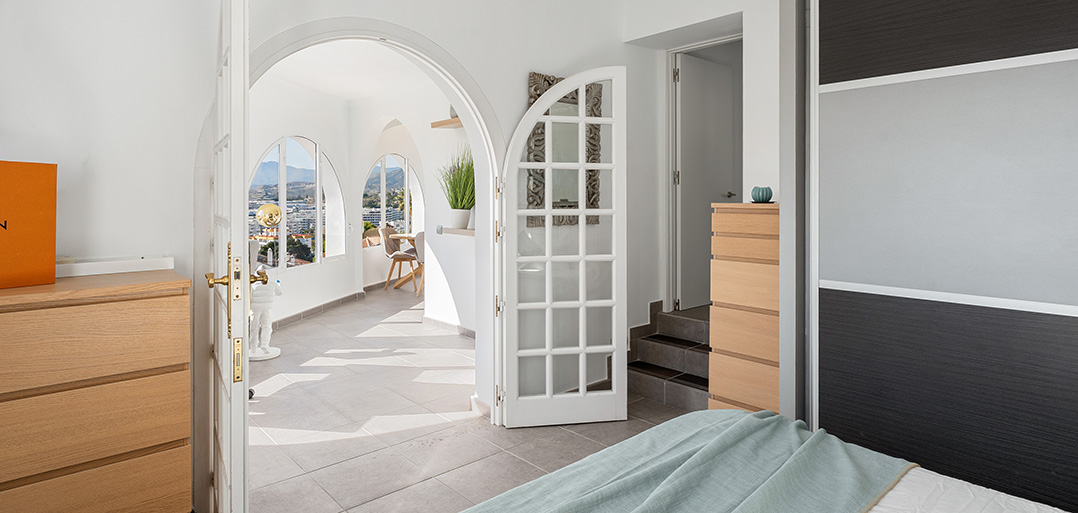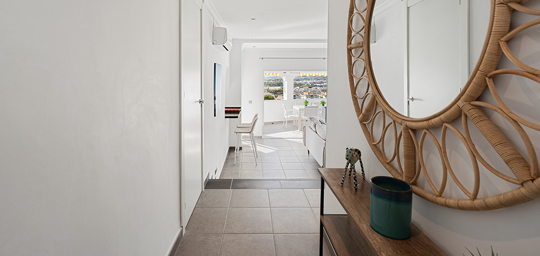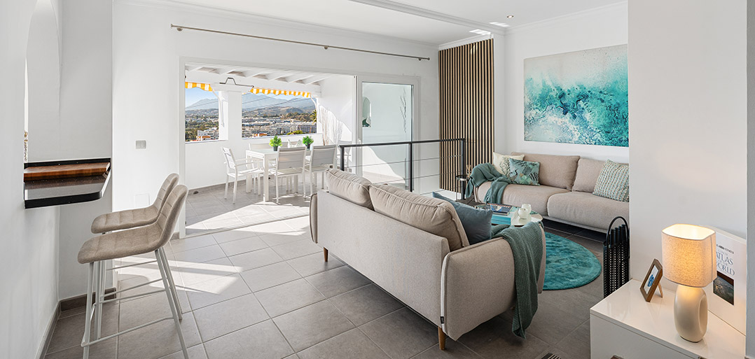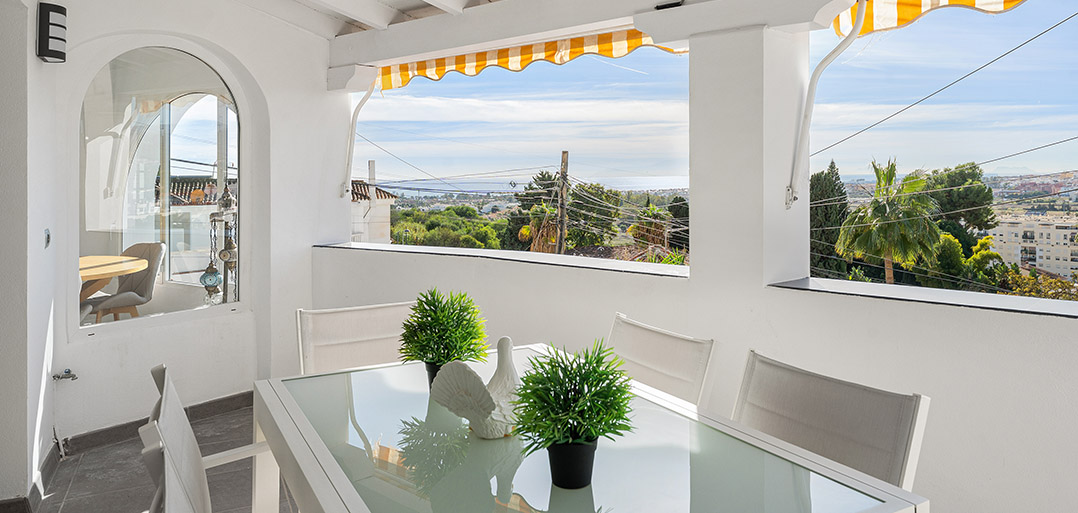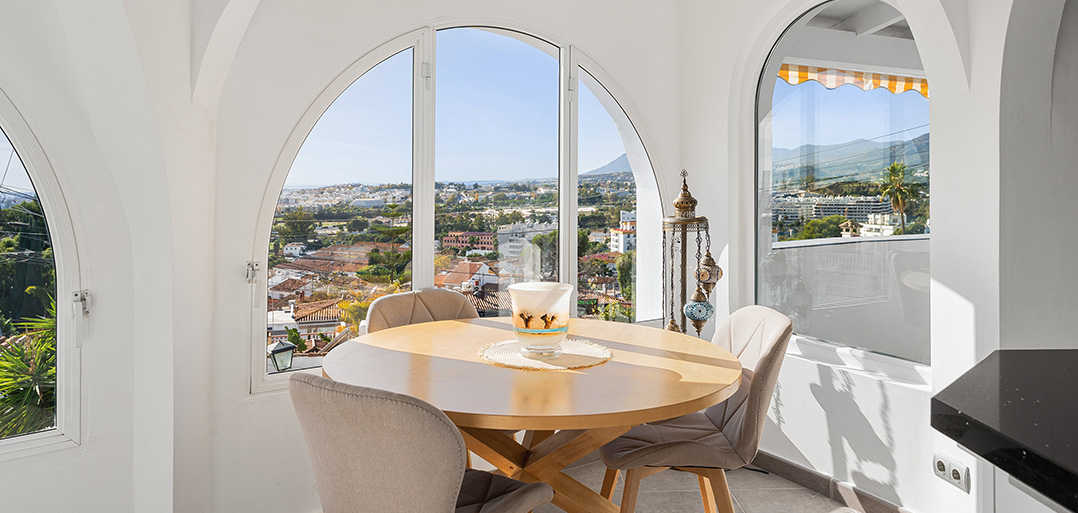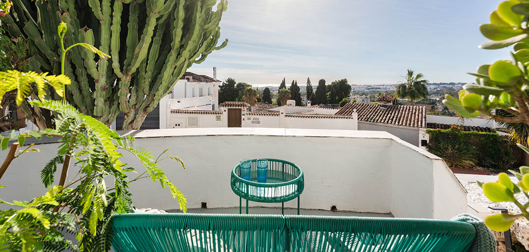 A lovely three bedroom townhouse boasting outstanding panoramic South facing views across the valley to the Sea. The property is situated elevated above a quiet one-way street in the heart of Nueva Andalucia in easy walking distance to shops and restaurants.