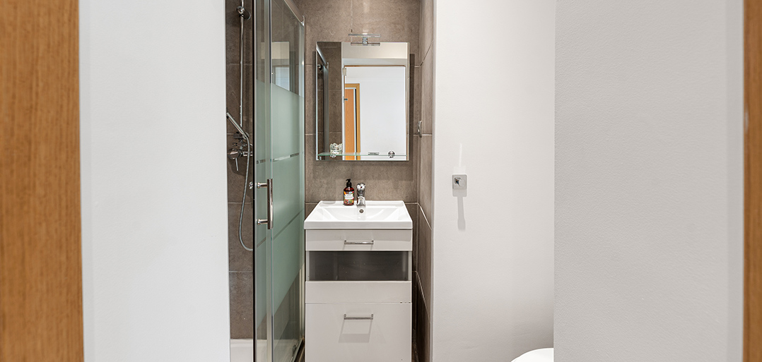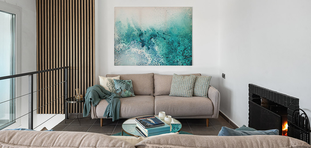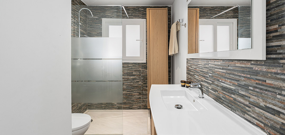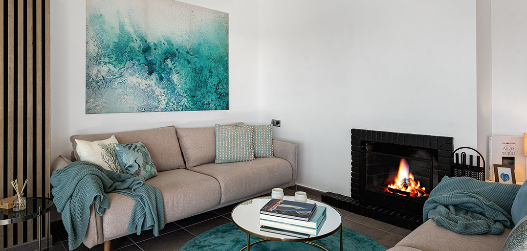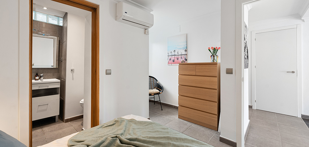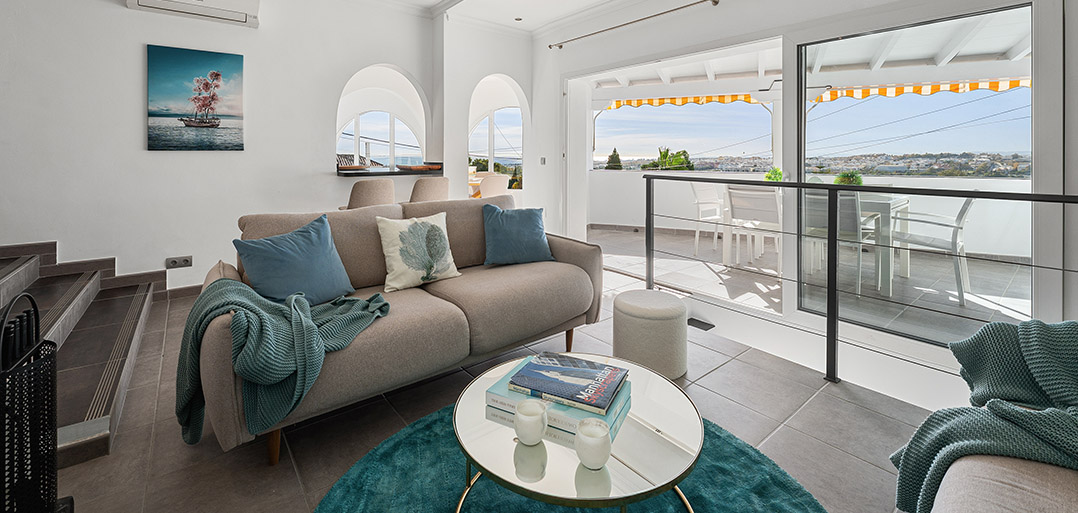 From the street stairs lead up to the front door passing on the right a sunny private terrace enjoying the views. By the front door is access to a laundry room. Entering this home into a good size hall with door to the second bedroom suite, a few stairs lead to the main reception with working fireplace and patio-doors opening on to a good size covered terrace.
