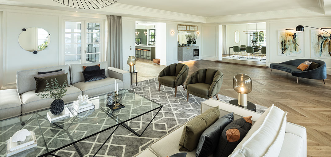 From an elegant hall on the main floor, one is met by fantastic ground floor accommodation; - several connected living spaces, each with views to the magnificent garden and sea, a large trendy fully equipped kitchen with central cooking island and a double bedroom with en-suite bathroom.